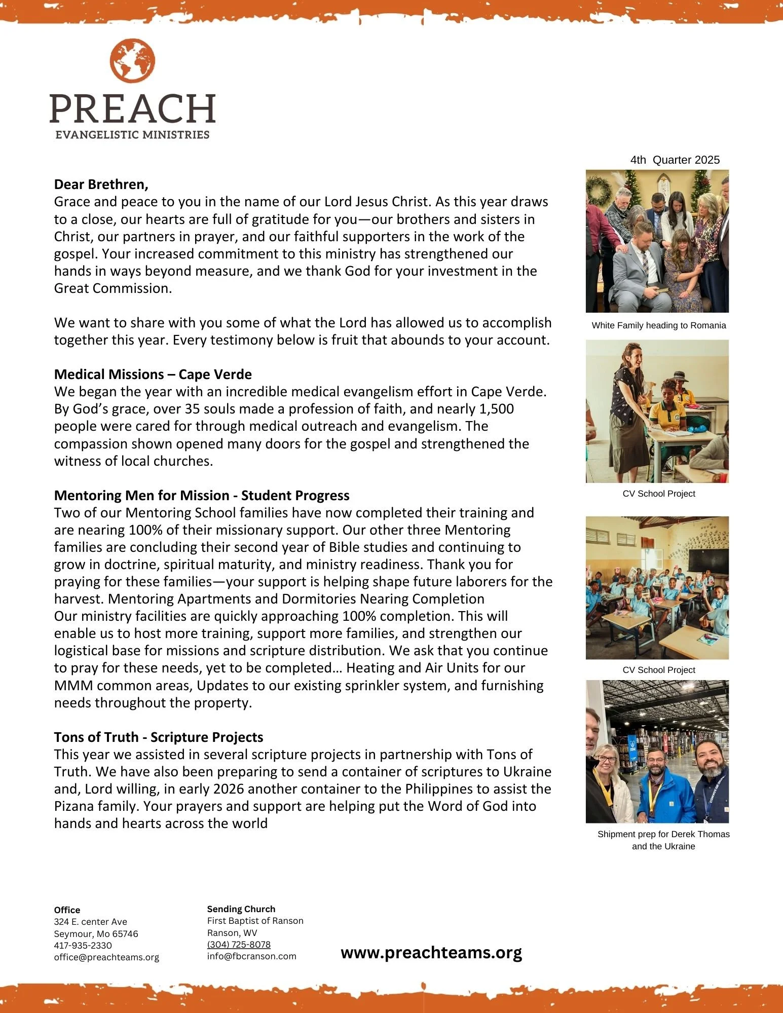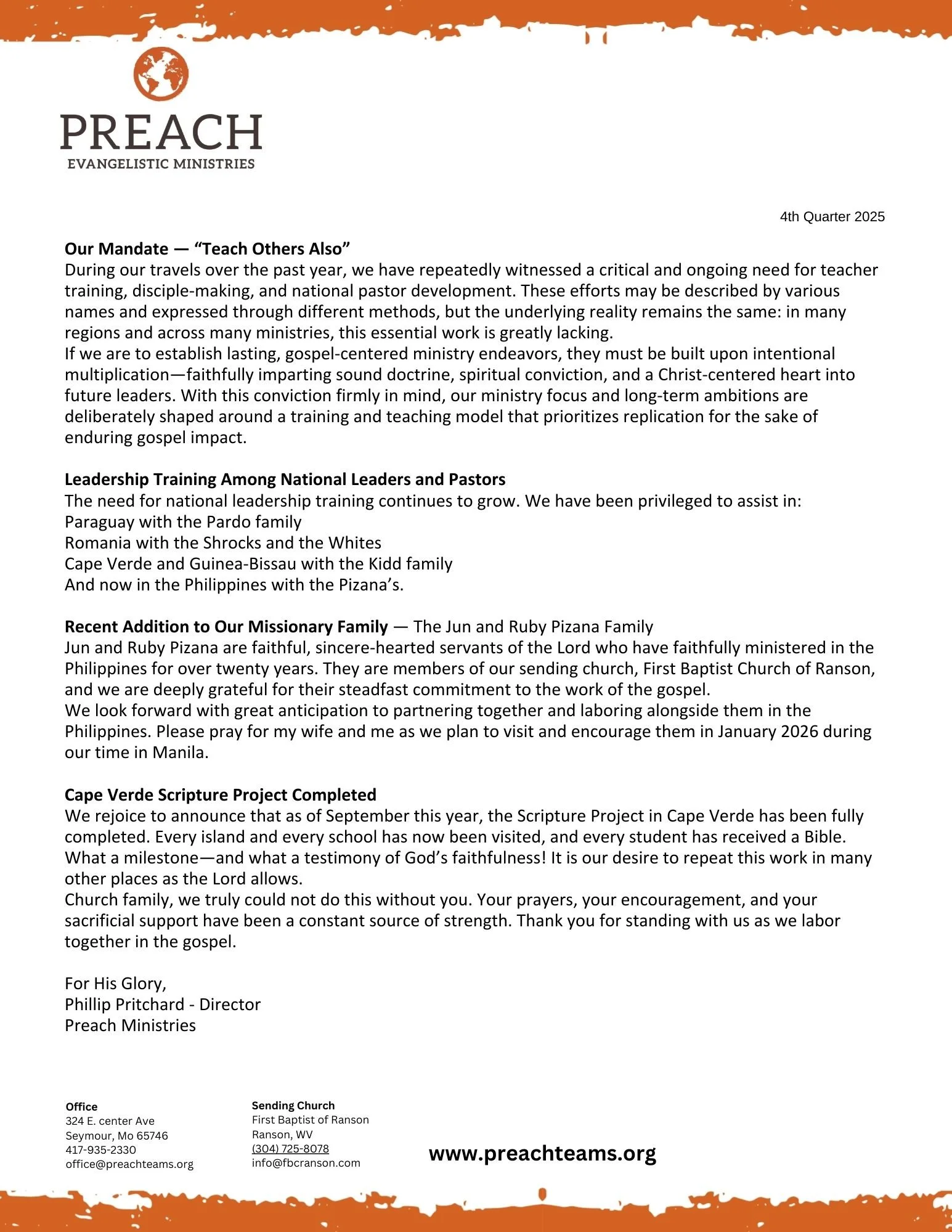 Phillip Pritchard and his wife Sarah are missionaries with Preach Evangelistic Ministries. Raised in Brazil, South America by missionaries Paul and Terri Pritchard, Phillip was saved at the age of 12 and surrendered to God’s calling four months later. Growing up, the Lord provided several opportunities to serve and train on the foreign field. Phillip spent three years at the Biblical School of World Evangelism, a ministry of the First Baptist church of Milford, OH. After college Phillip and Sarah completed a year internship with Preach Evangelistic Ministries. They spent 13 years ministering in Cape Verde W. Africa as church planters. After a fruitful time there with many leaders trained to continue the work they have made the transition back to the U. S. and Phillip now serves as director for Preach Evangelistic Ministries.